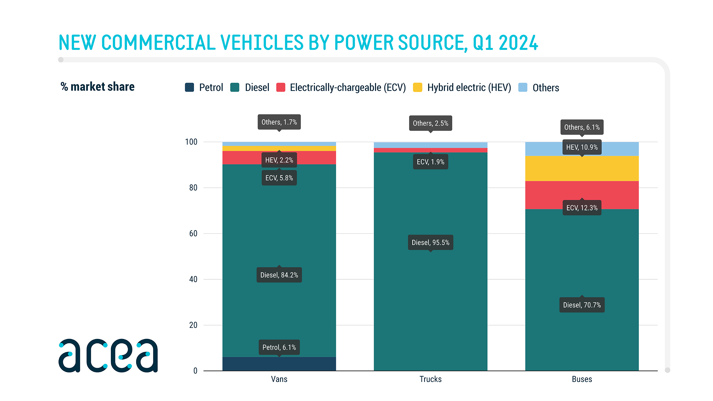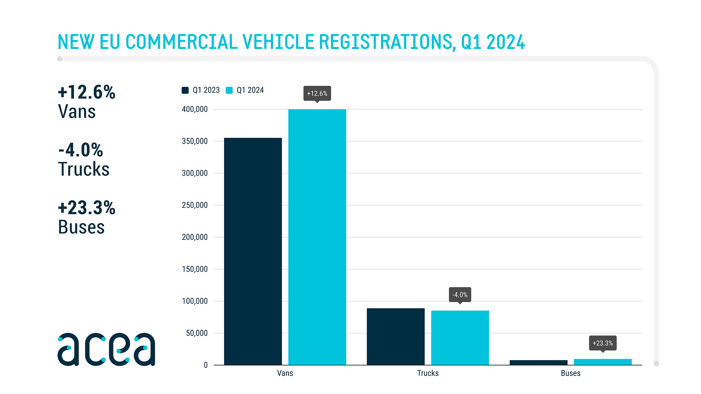 New commercial vehicle registrations: vans +12.6%, trucks -4%, buses +23.3% in Q1 2024