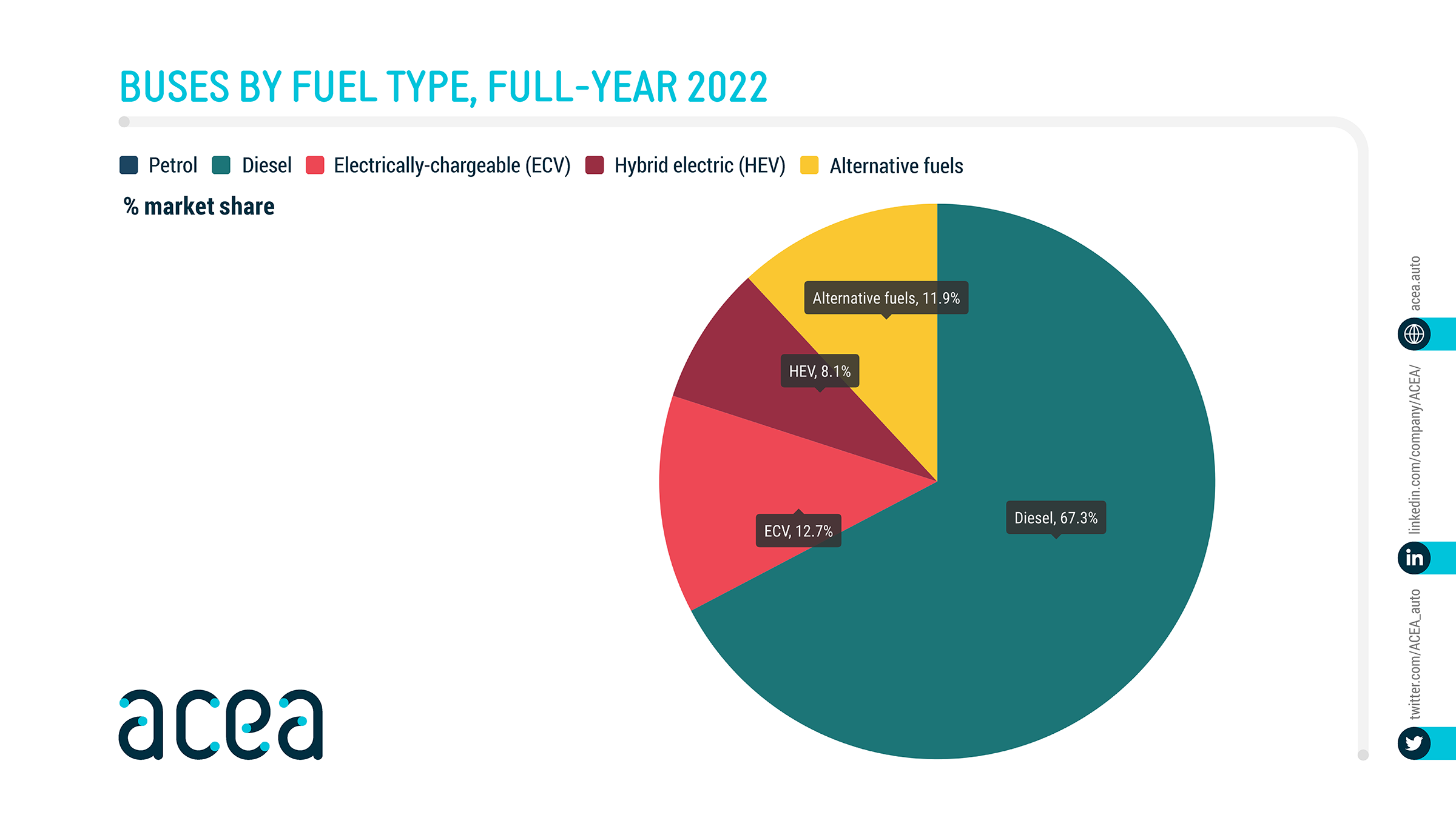 Fuel types of new buses: electric 12.7%, diesel 67.3% market share full-year 2022