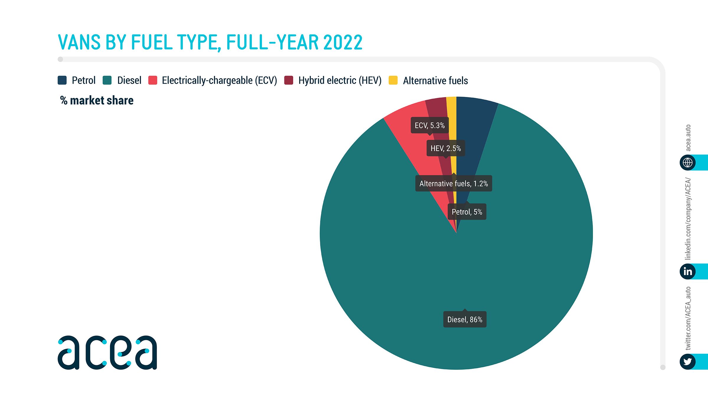 Fuel types of new vans: electric 5.3%, diesel 86.0% market share full-year 2022