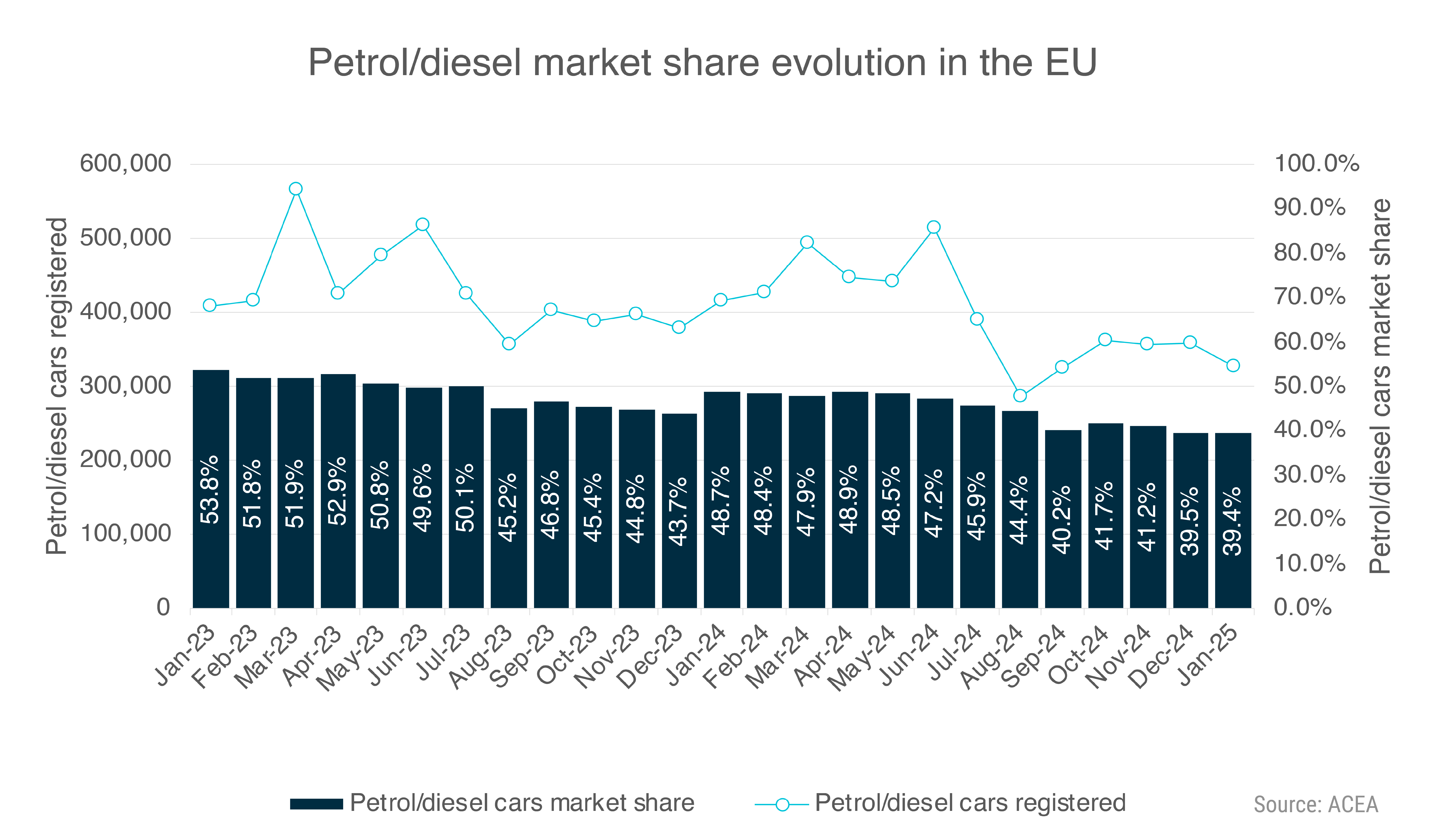 - The opposite is actually true: if OEMs were to produce and sell more ICE vehicles, they would need to produce even more ZEVs to offset emissions and meet the targets. Besides, the current data shows that the share of petrol/diesel cars has been consistently declining since 2023 even in the absence of the 2025 targets, which puts into question an assumption that introducing flexibilities would suddenly lead to the production of “additional ICE vehicles”.