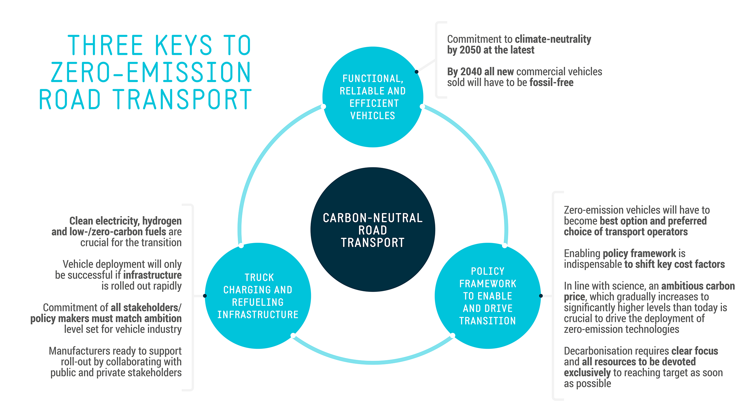 Manufacturers are already well on the way to implementing strategies for a rapid decarbonisation of road transport. This will require a fundamental shift in powertrain technologies. Zero-emission vehicles, namely battery-electric and hydrogen-powered vehicles, will have to become the backbone of road transport if the sector is to reach its decarbonisation targets.