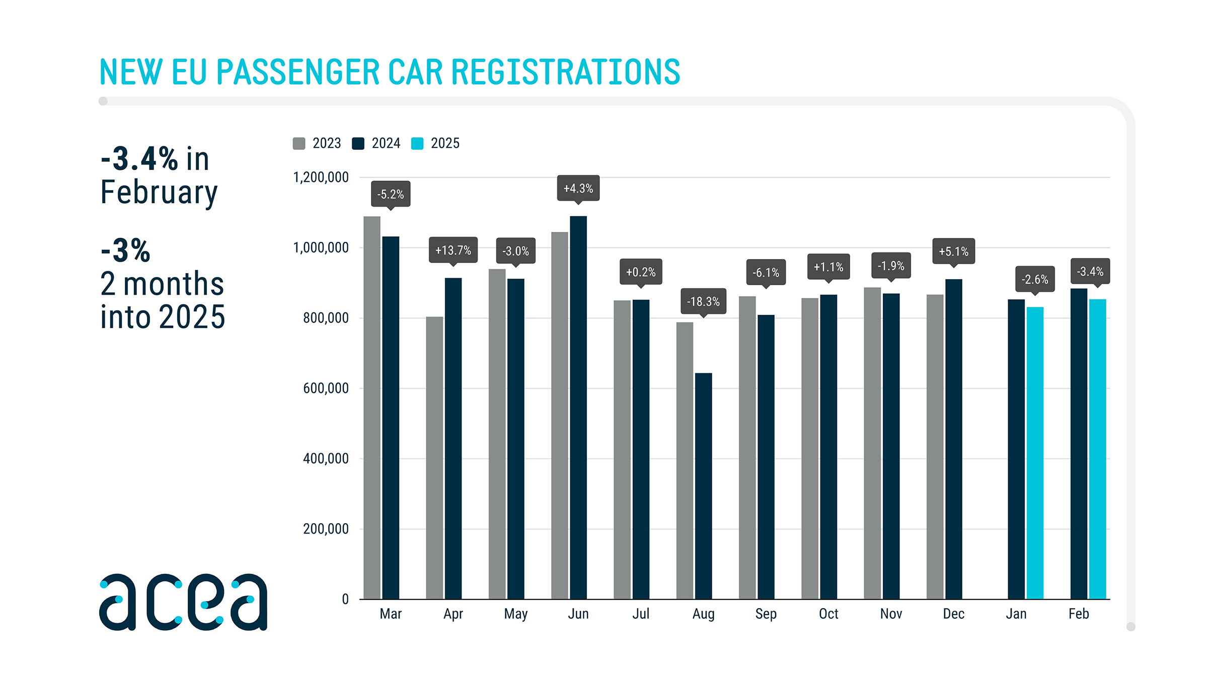 New car registrations: -3% in February 2025 year-to-date; battery-electric 15.2% market share