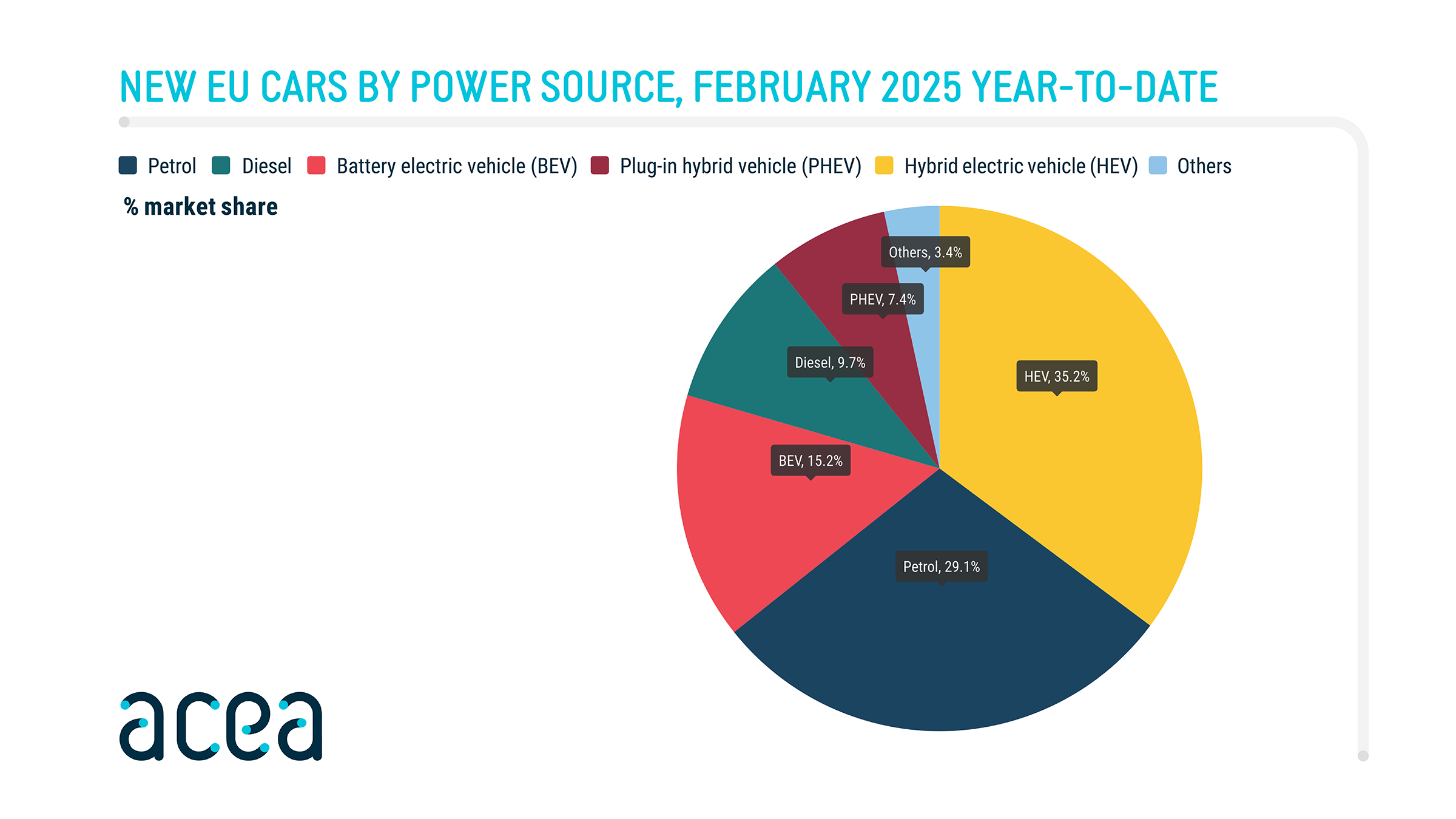 Up until February 2025, battery-electric vehicles (BEVs) accounted for 15.2% of total EU market share, signifying an increase from the low baseline of 11.5% in the comparable period of January-February 2024. Hybrid-electric vehicles surged, capturing 35.2% of the market and remaining the preferred choice among EU consumers. Meanwhile, the combined market share of petrol and diesel cars fell to 38.8%, down from 48.5% over the same period in 2024.