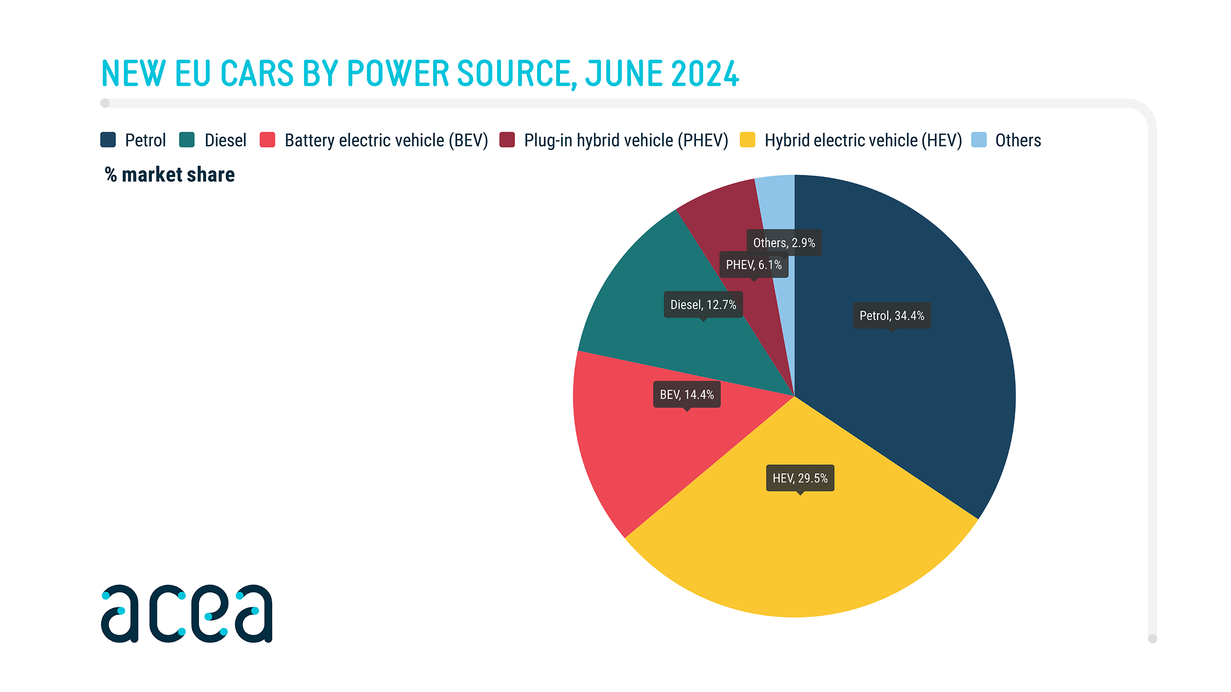 In June, battery-electric cars accounted for 14.4% of the EU car market, down from 15.1% the previous year. At the same time, hybrid-electric vehicles increased their market share, growing from 24.4% to 29.5%. The combined share of petrol and diesel cars fell to 47.1%, down from 49.6%.