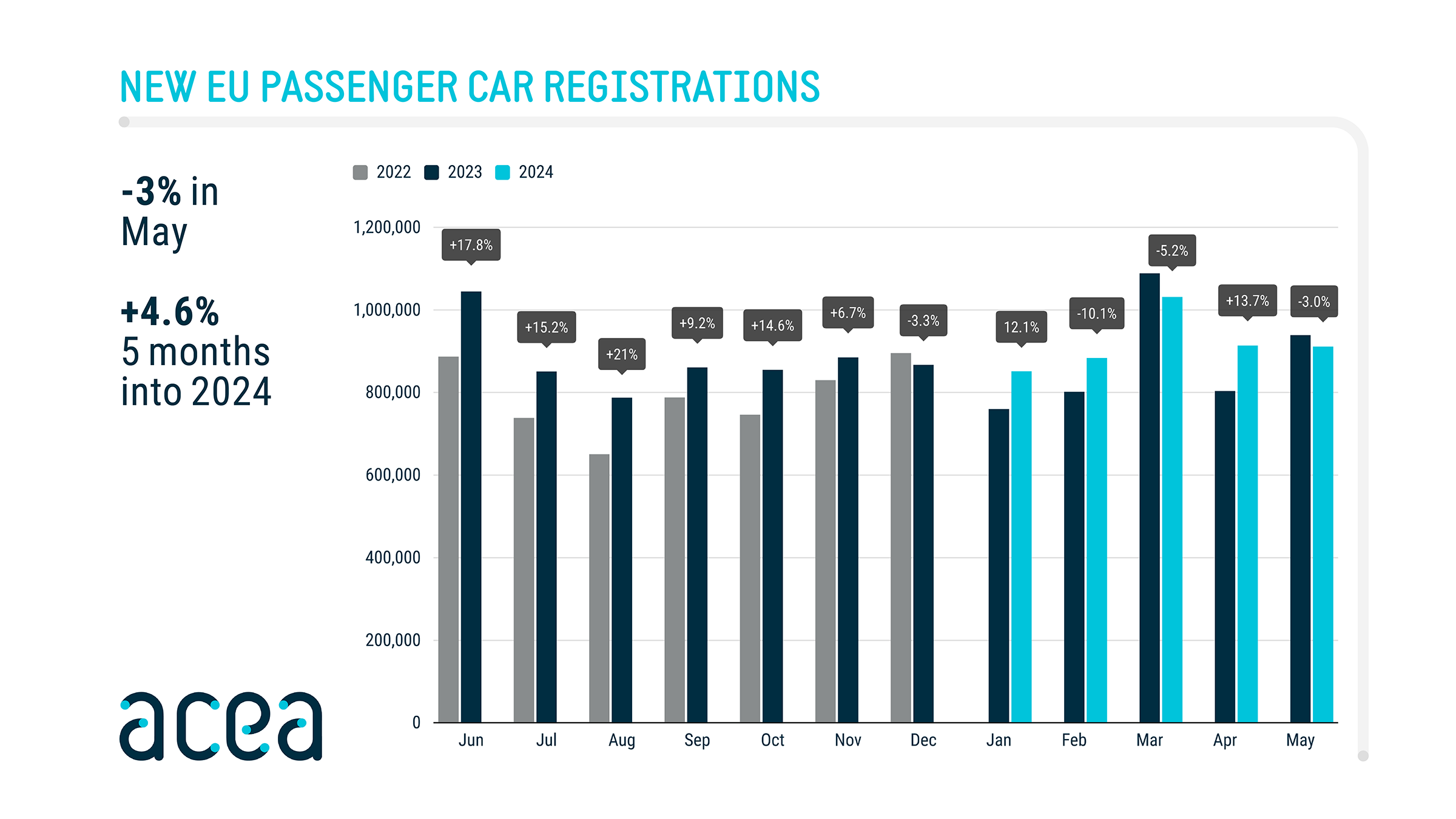 New car registrations: -3% in May 2024; battery electric 12.5% market share